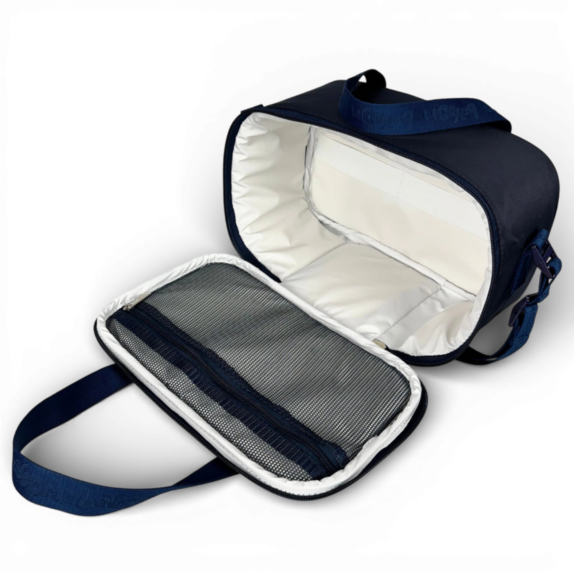 • Bolso interno respirável com fechamento em zíper, ideal para talheres, canudos, barrinhas e pequenos lanches