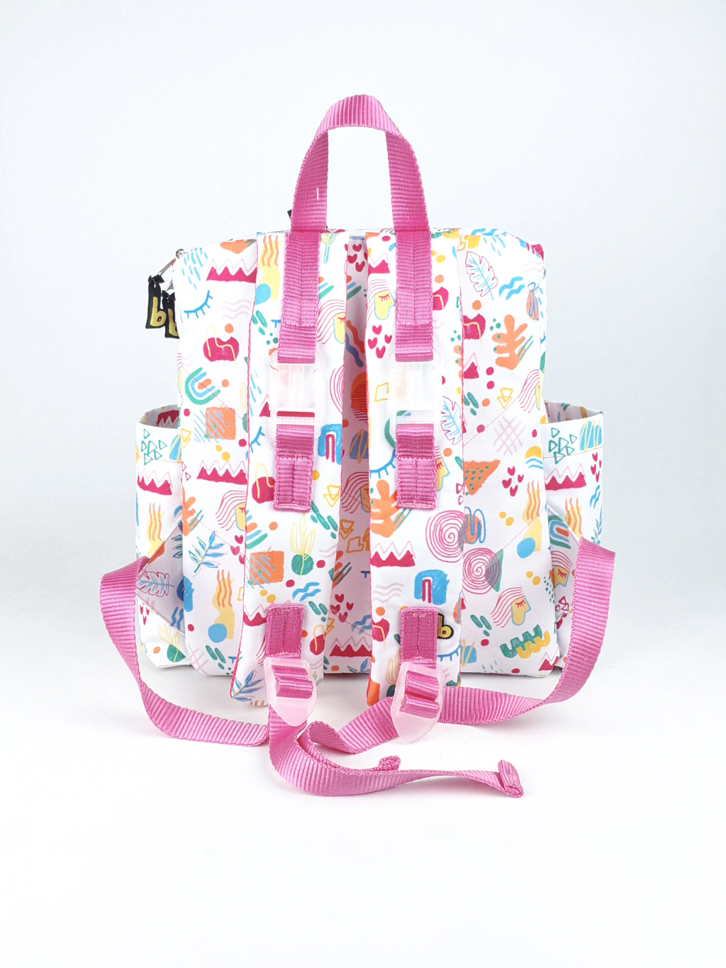 Bolsos laterais com espaço para garrafas – ideal para mamadeiras ou garrafinhas, sempre à mão.
